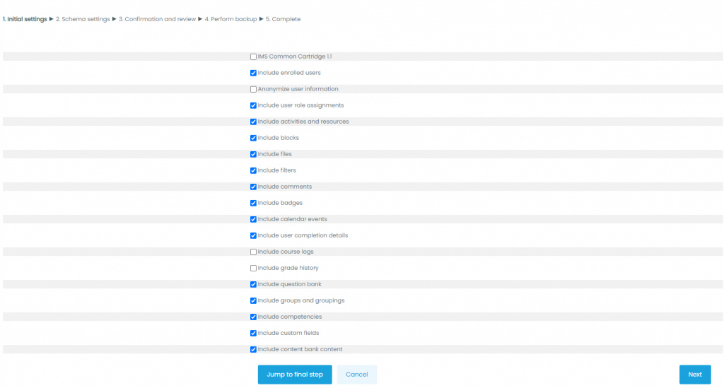 - Initial settings – Select activities, blocks, filters, and other items as required then click the Next button. Users with appropriate permissions, such as administrators and managers, can choose whether to include users, anonymize user information, or include user role assignments, groups, groupings, user files, comments, user completion details, course logs and grade history in the backup.