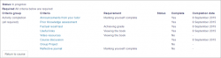 The course completion status block shows what has been done towards completing the course. The user and instructor will both see this block. The “More details” link will lead to a more detailed report. This report can have some interactive elements in the form of checkboxes for the user and instructor.