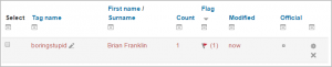 When someone adds an unsuitable or inappropriate tag, other users can click on the word (1) to get to the screen where they can flag it as inappropriate (2) The administrator can modify or delete inappropriate tags from Site administration>Appearance>Manage tags (3)