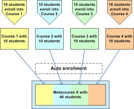 X is a meta course and Courses 1, 2, 3, 4 can be normal courses with standard user enrollments. These courses can contain resources and activities that are specific to those courses, but they may also only contain enrollments. Users enrolling in Courses 1 or 2, or 3 or 4, are automatically enrolled onto Meta course X when the course is associated as a child course to Meta course X. The meta course is dependent upon its enrollments from each of the non-meta courses, the child courses.
