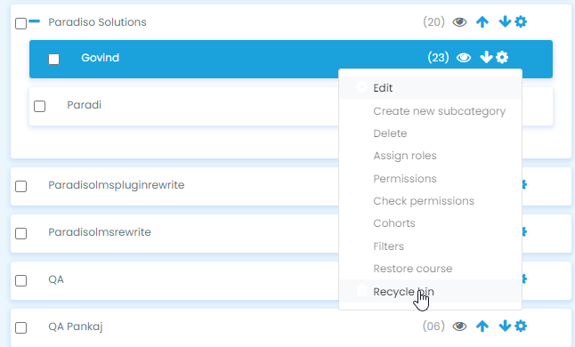 • Administrators can modify the settings from “Recycle bin in the Site administration and can decide how long an item or a course will remain available until it is permanently deleted and make the recycle bin visible in the administration block even when empty. If preferred, the recycle bin can be disabled.