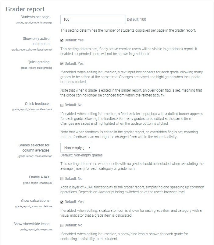 The gradebook report settings determine the appearance of gradebook reports in all courses on the site. The site administrator will find the default and enabled/disabled settings in the administration area. There