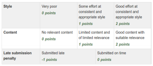 • Numeric points are required, but if you want to use your rubric to give feedback without a numeric grade it is possible to hide these from users and hide the final calculated grade from users.