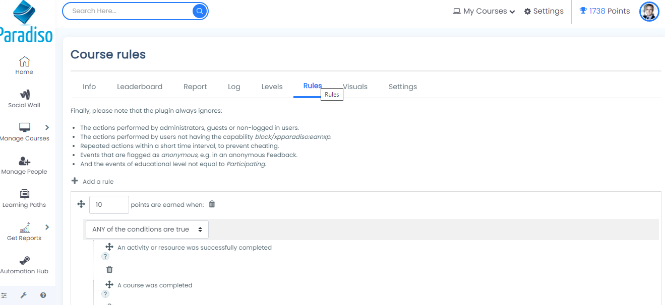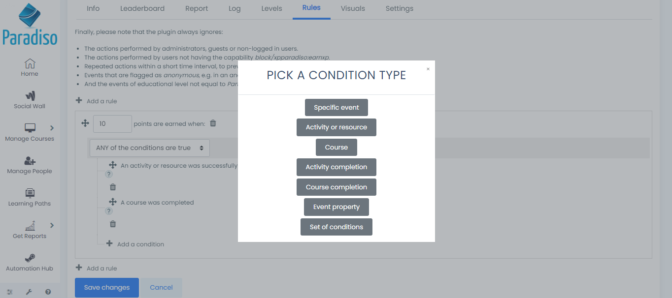 – To add the point admin, need to create a rule for the same, There are multiple activities on which user can earn the point such as ‘Specific event’, ‘Activity completion’, ‘Activity or resource’, ‘Course completion’, ‘Event property’, ‘Set of conditions.