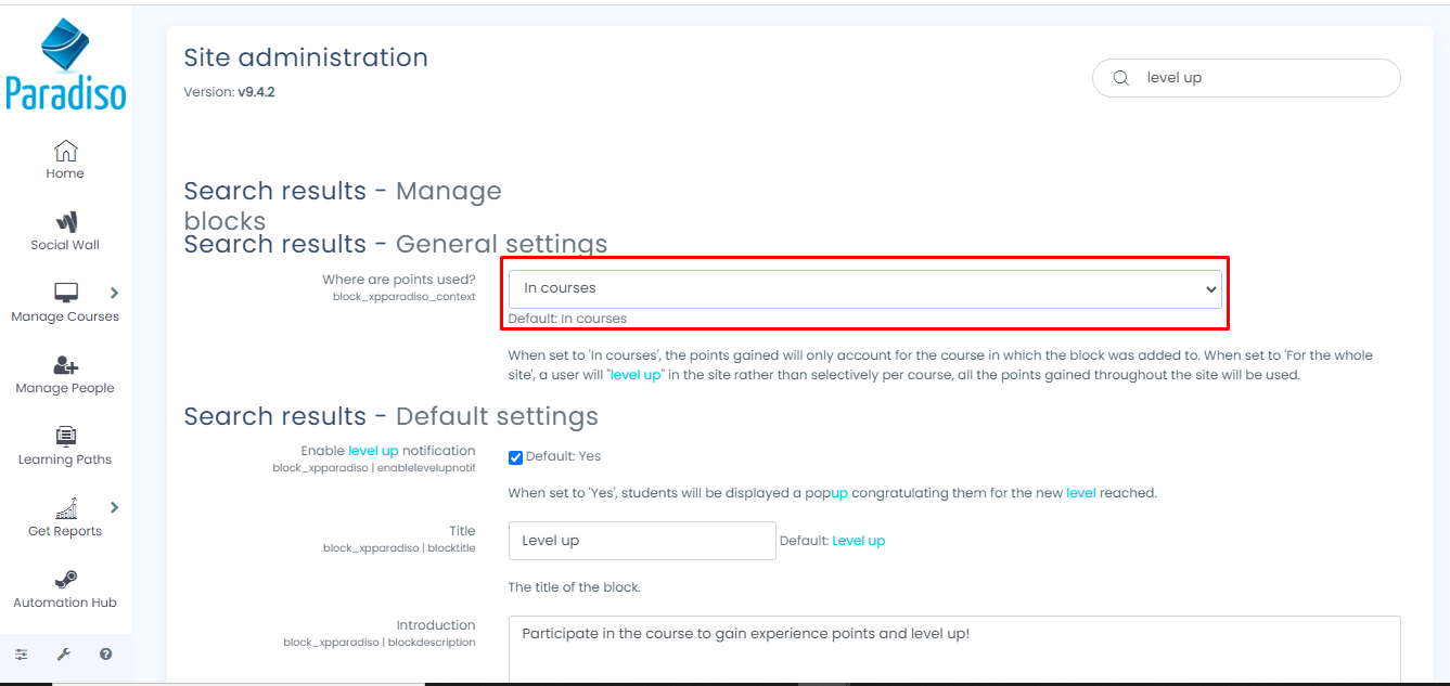 1. To set the course level setting, admin need to go site setting add level up text in the search bar and hit the enter.