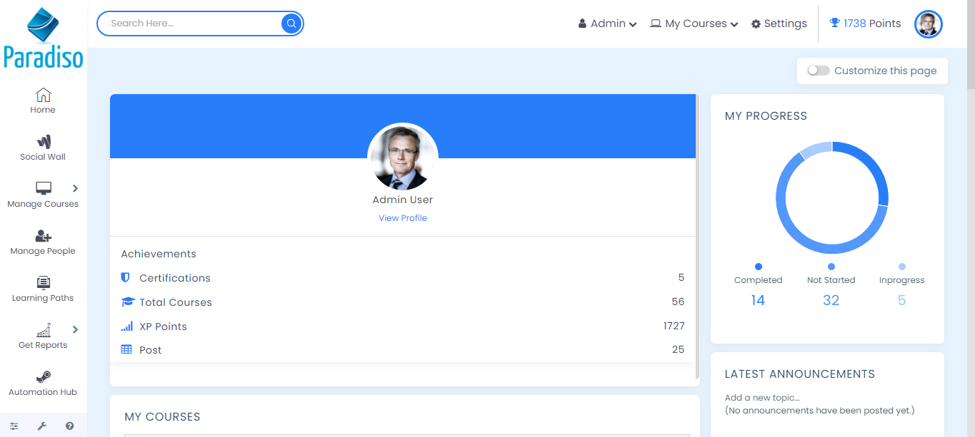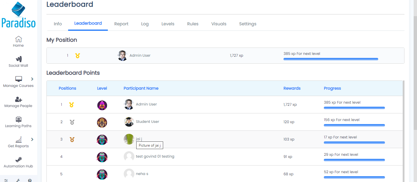 - The user will get to know the progress and ranking of learner as well he can get to know his position in the list in terms of progress.