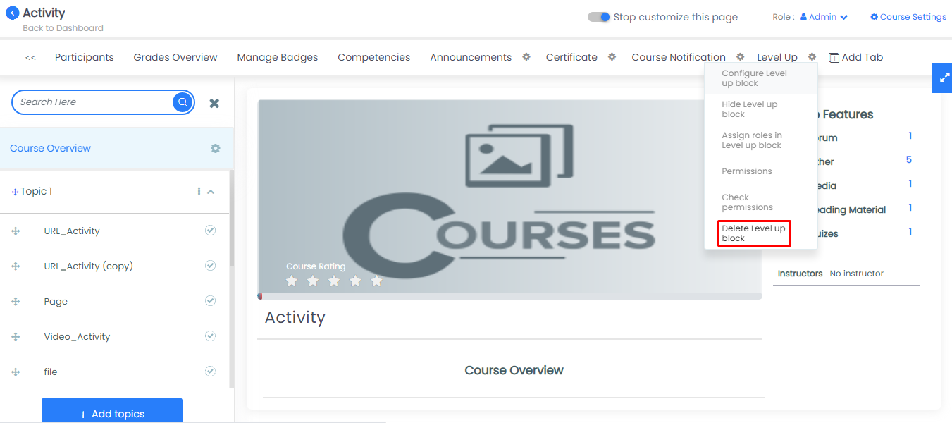 Admin can’t delete the Level up, Admin can able to delete the level up block.