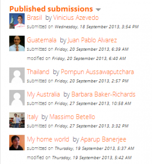 When in the Grading evaluation phase, it is possible to publish (ie make visible to all participants) selected submissions you might consider are helpful examples. To do this, as the instructor, choose a particular submission and click its title. Scroll down and below the submission text, you will find a form allowing you to mark the submission as published. Save the form. When the workshop is closed, any such published submissions become visible.