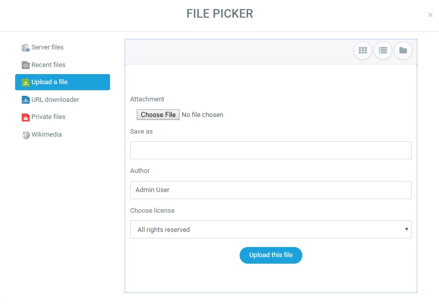 The file picker enables files to be selected and displayed in LMS – for example, when an editing teacher/instructor clicks Add an activity or resource > File, or when a forum participant adds an attachment to a post.