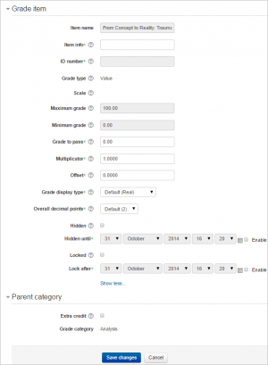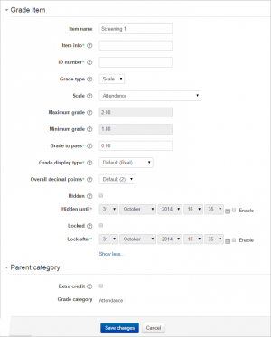• Hidden until: An optional date after which the grade item will no longer be hidden (i.e. a grades release date)