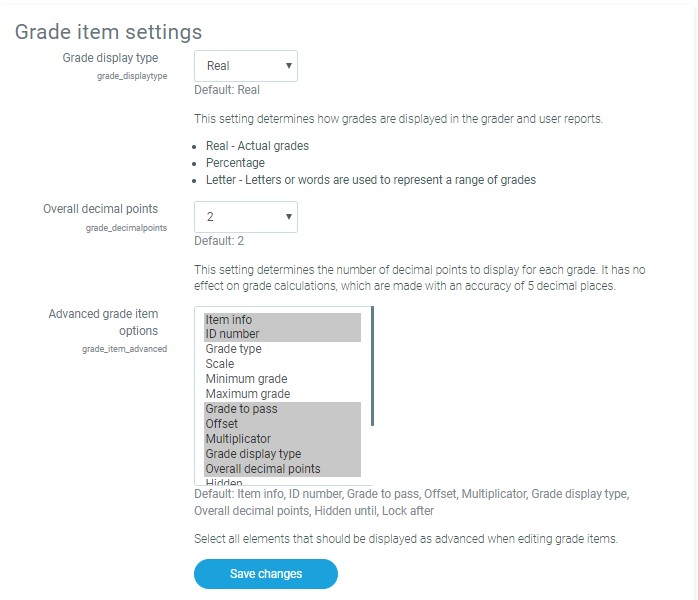 Grade item settings, accessed from Settings > Grades > Grade item settings, are the various settings that the administrator is able to edit for the grader report used by instructors. These settings will change what items are displayed for each grade. As an administrator, you would turn on or off various settings and the instructor would input the actual data.