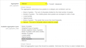 Note that reducing the number of aggregation types simply results in disabled aggregation types not appearing in the aggregation type drop-down menu. All existing grade category calculations remain the same, regardless of whether the aggregation type is later disabled by an administrator.