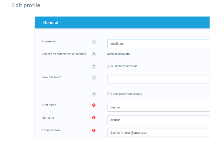 Depending on the administrator’s settings (in the relevant authentication plugin settings) users may or may not be able to edit username, password or the above mentioned mandatory fields.