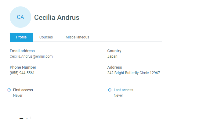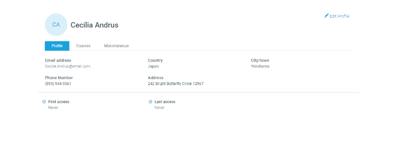 This section displays the current user information such as email, country, city, phone number, address, first and last access to the LMS.