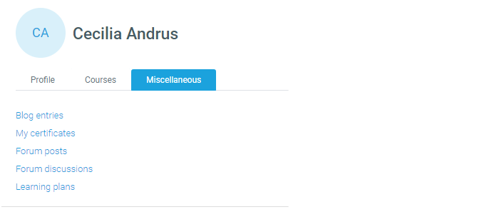 This section provides access to different items such as Certificates, Forum posts done by the user, Learning plans.