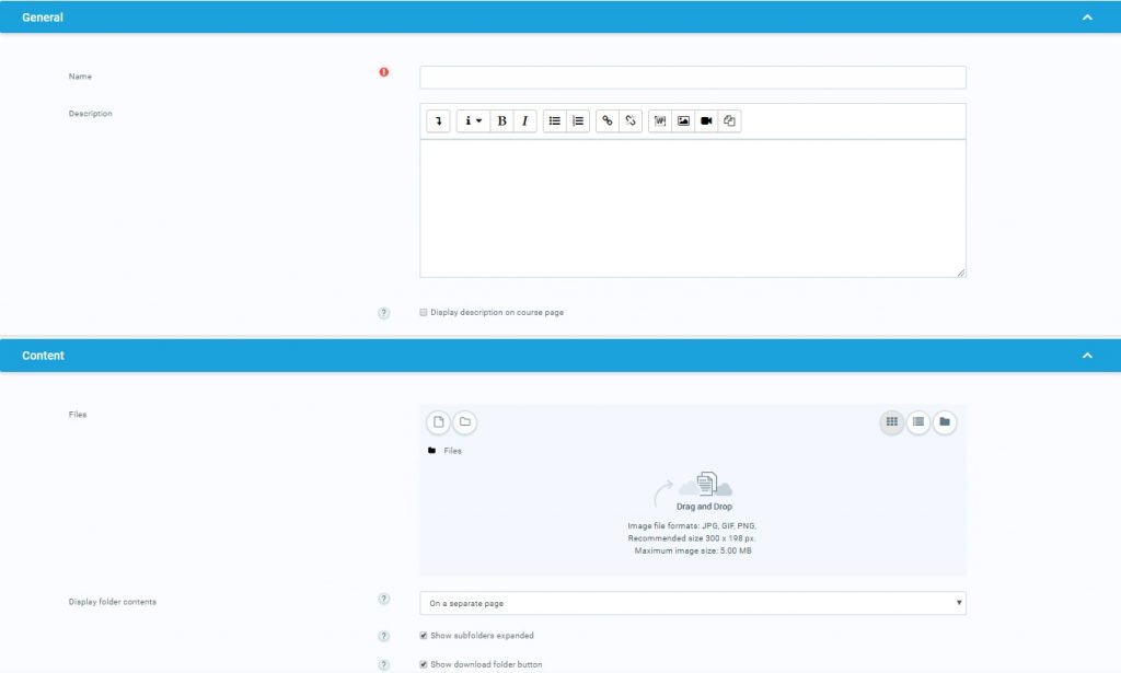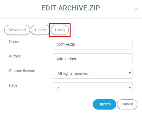 If you uploaded a zip file into a File or Folder Resource, you can uncompress and expand it into its various files. To do this, go into Edit settings for the resource, right click on the file icon in the Select files area, and then click on the Unzip file button.