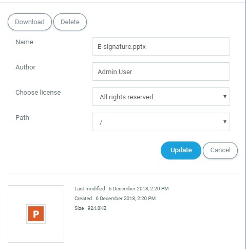 • Clicking on the name of an uploaded file opens up a pop-up dialogue box which allows file details quickly to be altered.
