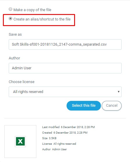 • When an uploaded file – or a file from the Private files, Dropbox, File system or EQUELLA repositories – is re-used elsewhere on LMS, the instructor has the option to make a copy (a new, unconnected version) or to create a shortcut or alias.