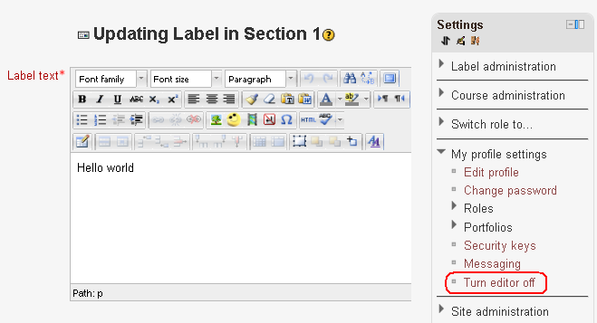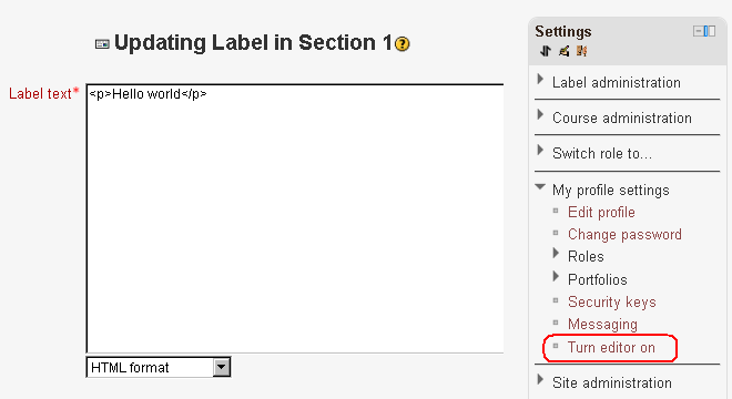 The Profile switches local plugin offers the user a convenient way to switch the html editor in LMS forms on/off from the settings block without having to edit the user profile.