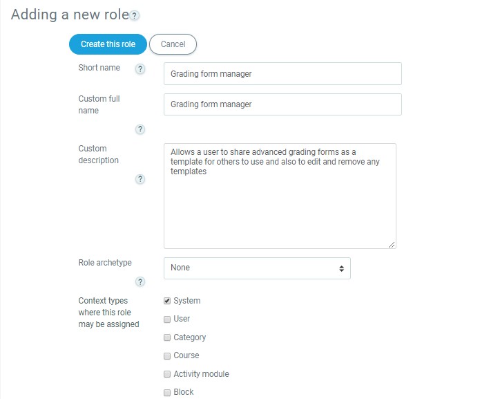 The custom role of Grading forms manager allows a user to share advanced grading forms (such as rubrics) as a template for others to use. It also allows them to edit and remove templates others have shared as well as their own. (If you only wish a user to share and manage their own templates, and not those others have created, then see the custom role Grading forms publisher)