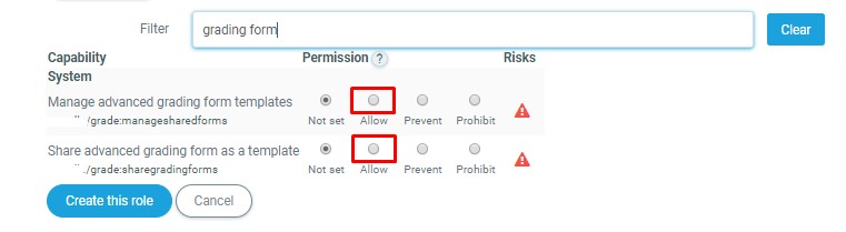 4. In the filter, type “grading form” to quickly display the capabilities of lms/grade:managesharedforms and lms/grade:sharegradingforms