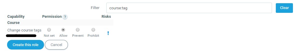 • In the filter, type ‘course:tag’ and set this to ‘Allow’ (You might need to ‘Show advanced’)