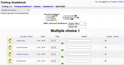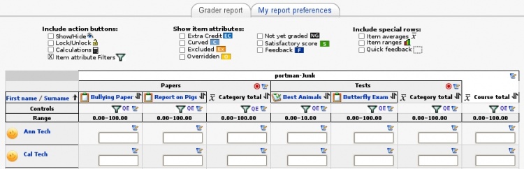 To build on what Matt said above I’ve created some mockups of improvements to the interface of the grader report. The major feature that applies to this topic is the use of grade item attributes that can be checked on or off in the header of the report (much the same way “Show Hide/show icons” and “Show locks” are now done). I’ve taken the liberty to update the language to be more noun or verb focused based on attribute or action respectively.