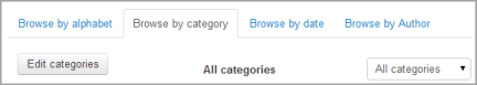 Categories may be created to help organize your glossary entries. If you’ve enabled autolinking, the category names can be linked along with individual entries. Make sure your chosen display format has categories as a visible tab in Settings>Plugins>Activity modules>Glossary