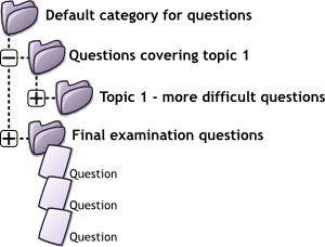 You can imagine a question category as a folder on your desktop computer. Then, questions are stored in these categories in a similar way as your files are stored in a file system.