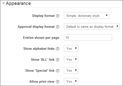 It is possible to set an alternative display format for when entries are approved that can differ from the display format on the course page. This could be useful for instance if a tutor wants to see who made a particular glossary entry before approving it but doesn’t want the users’ name to be displayed for others on the course page.