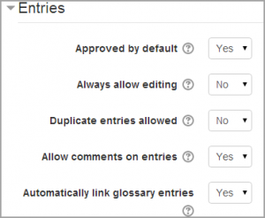 Default settings for a glossary activity and for adding a new entry can be set by an administrator in Site administration > Plugins > Activity modules > Glossary.