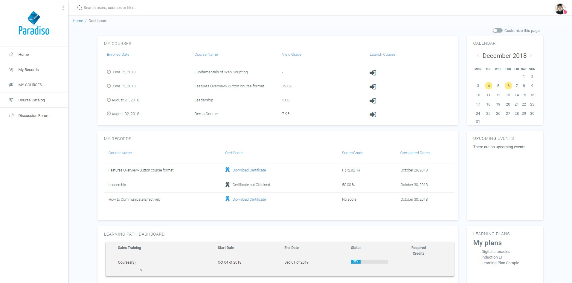 The Dashboard is a customizable page for providing users with details of their progress and upcoming deadlines. In the center is the Course overview block which allows users and instructors to easily track required activities and filter courses.