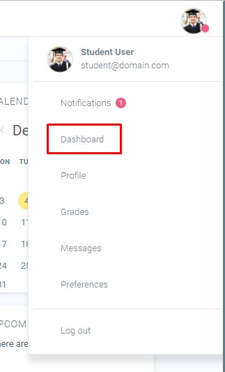 Quick access to Dashboard is also available from the user menu top right of the screen once logged in:
