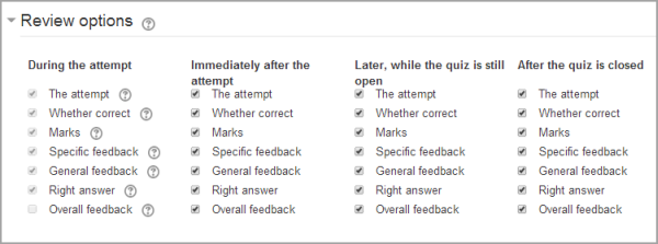 This section controls what information users will be shown when they review their past attempts at the quiz, and during the attempt in adaptive mode. It is a matrix with checkboxes.