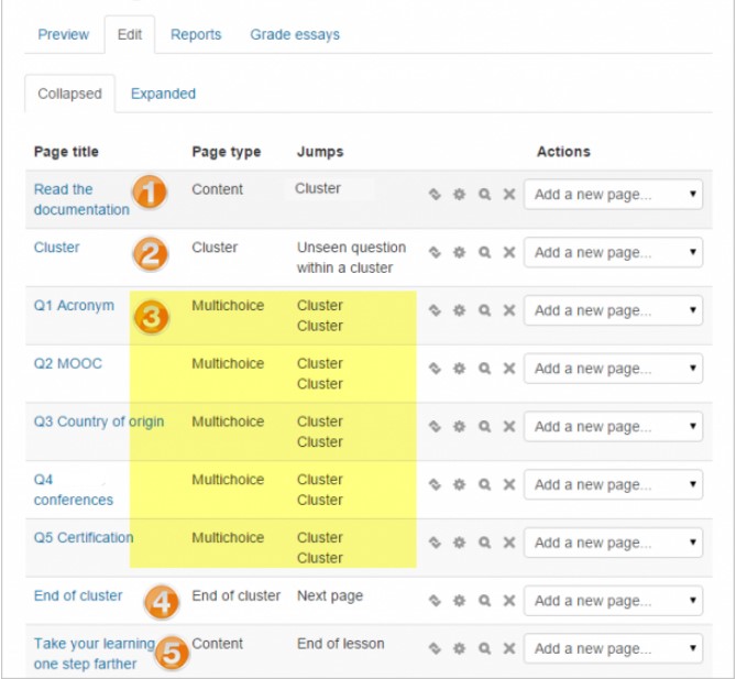 A cluster typically contains question pages (such as multiple choice) which are presented randomly to each user who does the lesson. (If you are happy for your learners to see each question page in the same order, then you don’t need clusters)