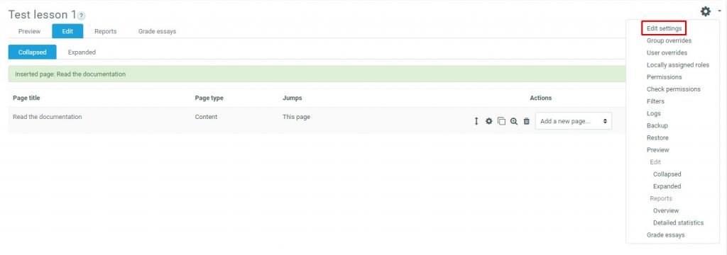 • In Lesson administration>Edit settings>Flow control, set ‘Provide option to try question’ again to No and ‘Maximum number of attempts’ to 1