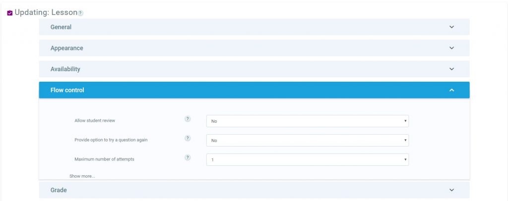 • In Lesson administration>Edit settings>Flow control, set ‘Provide option to try question’ again to Yes and ‘Maximum number of attempts’ to 1