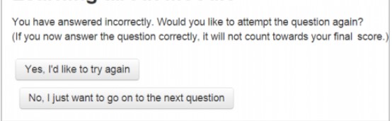 When a learner tries the questions and gets one wrong, they will be presented with the option to try again (for no score) or to ignore this question and move onto the next question.