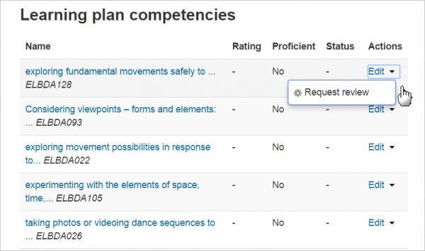 When a user clicks the name of a learning plan, they see the associated competencies. They can see their progress towards completion and also click ‘Edit’ to request a review of any competency: