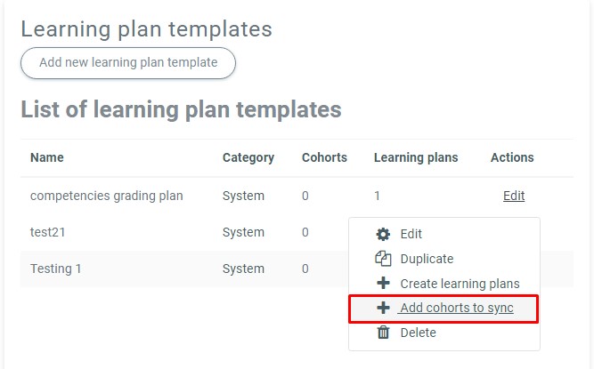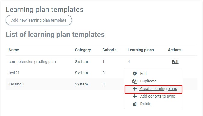 - Go to Settings > Site administration > Competencies > Learning plan templates. Any existing plans are displayed here, and you can click the button ‘Add new learning plan template’ to create a new one.