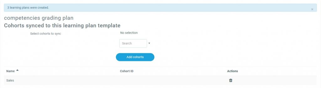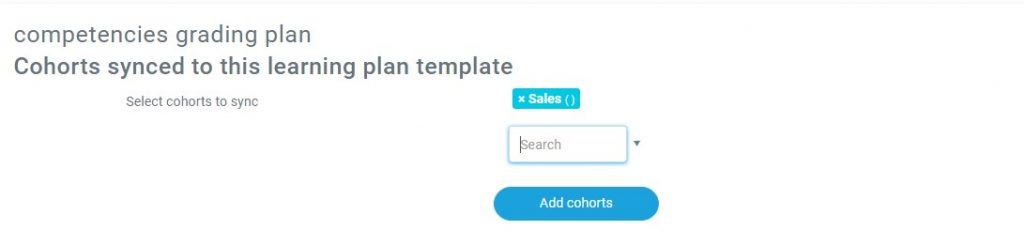 - To assign a learning plan to a cohort, click ‘Add cohorts to sync’