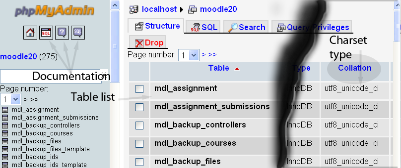 Once selected, you will see what the charset is of each table. Any table that does not comply you can change using the table SQL code above.