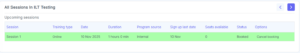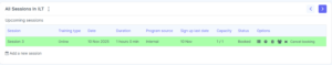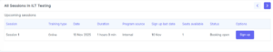 Here you can see all upcoming and previous sessions for selected ILT activity.