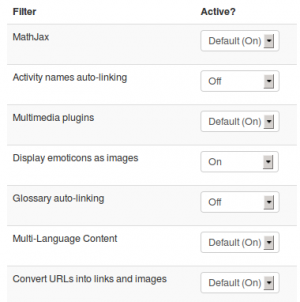 - Select ‘On’ (always available for all courses), ‘Off but available’ (teachers can choose whether to enable the filter for the course or activity) or ‘Disabled’ (always off for all courses) as required for each filter.