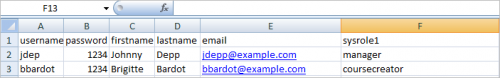 username,password,firstname,lastname,email,course1,group1,cohort1 jonest,verySecret3$,Tom,Jones,jonest@example.com,math102,Section 1,year 3 reznort,someSecret4#,Trent,Reznor,reznort@example.com,math102,Section 3,year 4