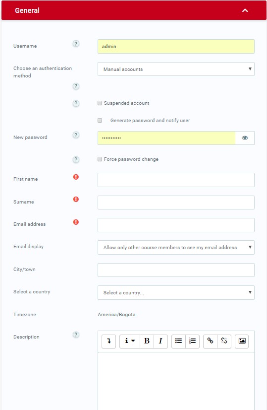 Note: City and country defaults may be set in Settings > Site administration > Location > Location settings.