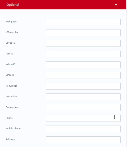 Web Page, ICA number, Skype ID, AIM ID, Yahoo ID, MSN ID, ID number, Institution, Department, Phone, Mobile Phone, Address.