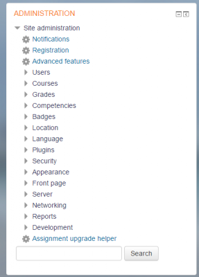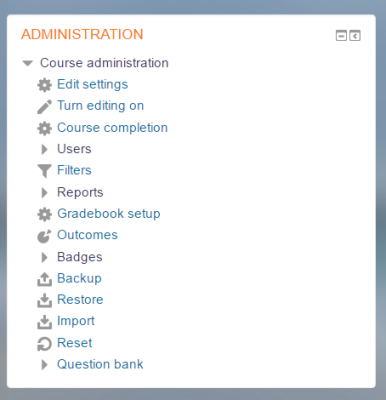 What appears in the administration block depends upon where the user is and what role they have in that location. For example, a site administrator on the front page will have Front page settings while an instructor in a course will have more options in Course administration than a student user.