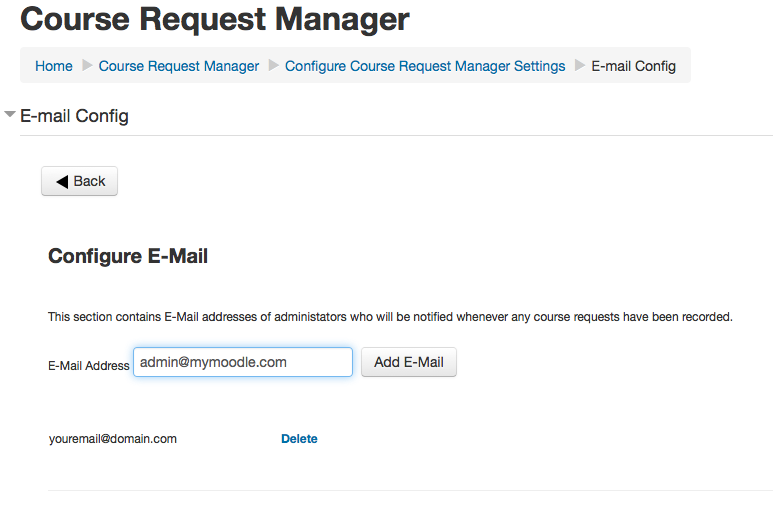 The first recommended step involves adding at least one email address of an administrator who will handle course requests. The system has been set up with a dummy email address (youremail@domain.com), which should be deleted. To enter a new email, simply enter the email address and click on the ‘Add E-Mail’ button.