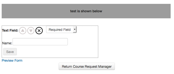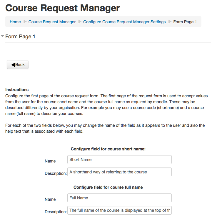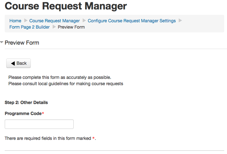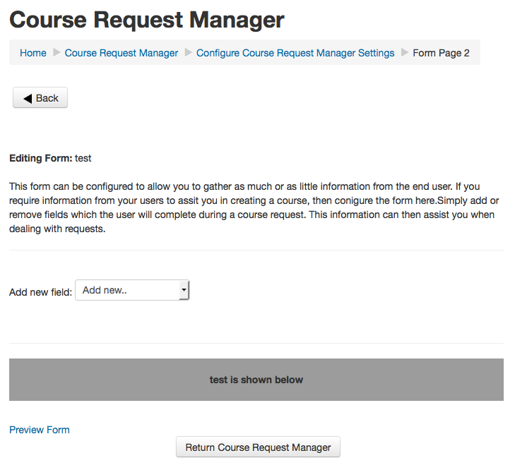 - This allows you to configure the 2nd page of the request. On this page you can create form elements that must be completed by the user as part of the request process. While this information is not used by Course Request Manager, it will allow administrators to gather structured information on the request and aid in the decision making process.
